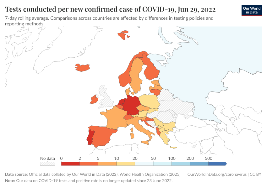 “Data Page: Tests conducted per new confirmed case of COVID-19”. Our World in Data (2025). Data adapted from Official data collated by Our World in Data, World Health Organization. Retrieved from https://archive.ourworldindata.org/20251229-063330/grapher/tests-per-confirmed-case-daily-smoothed.html [online resource] (archived on December 29, 2025).How to cite this data