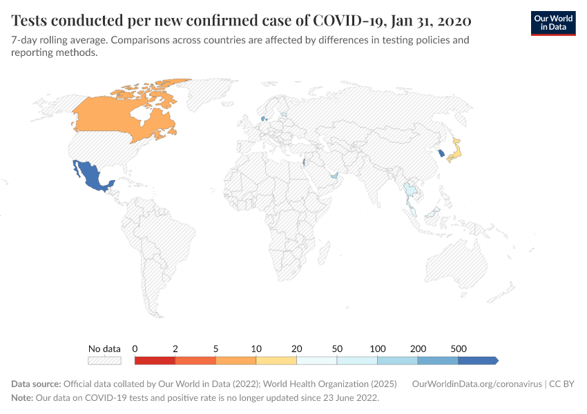 “Data Page: Tests conducted per new confirmed case of COVID-19”. Our World in Data (2025). Data adapted from Official data collated by Our World in Data, World Health Organization. Retrieved from https://archive.ourworldindata.org/20251218-063317/grapher/tests-per-confirmed-case-daily-smoothed.html [online resource] (archived on December 18, 2025).How to cite this data