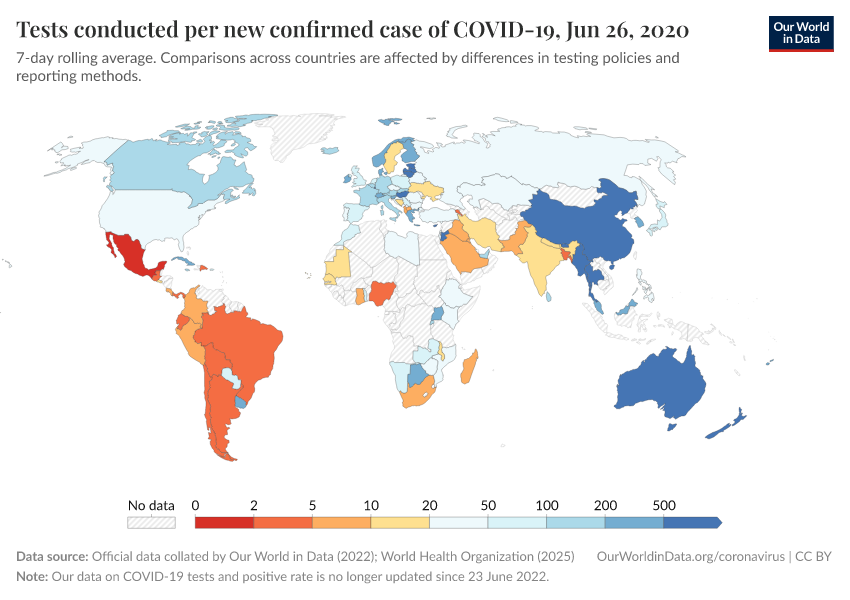 “Data Page: Tests conducted per new confirmed case of COVID-19”. Our World in Data (2025). Data adapted from Official data collated by Our World in Data, World Health Organization. Retrieved from https://archive.ourworldindata.org/20251215-063346/grapher/tests-per-confirmed-case-daily-smoothed.html [online resource] (archived on December 15, 2025).How to cite this data