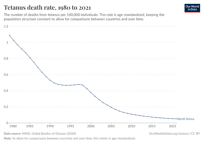 IHME, Global Burden of Disease (2024) – with minor processing by Our World in Data. “Tetanus death rate” [dataset]. IHME, Global Burden of Disease, “Global Burden of Disease - Deaths and DALYs” [original data]. Retrieved December 5, 2025 from https://archive.ourworldindata.org/20250909-093708/grapher/tetanus-death-rate.html (archived on September 9, 2025).