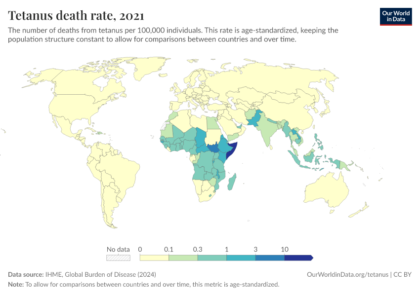 IHME, Global Burden of Disease (2024) – with minor processing by Our World in Data. “Tetanus death rate” [dataset]. IHME, Global Burden of Disease, “Global Burden of Disease - Deaths and DALYs” [original data]. Retrieved January 15, 2026 from https://archive.ourworldindata.org/20250909-093708/grapher/tetanus-death-rate.html (archived on September 9, 2025).