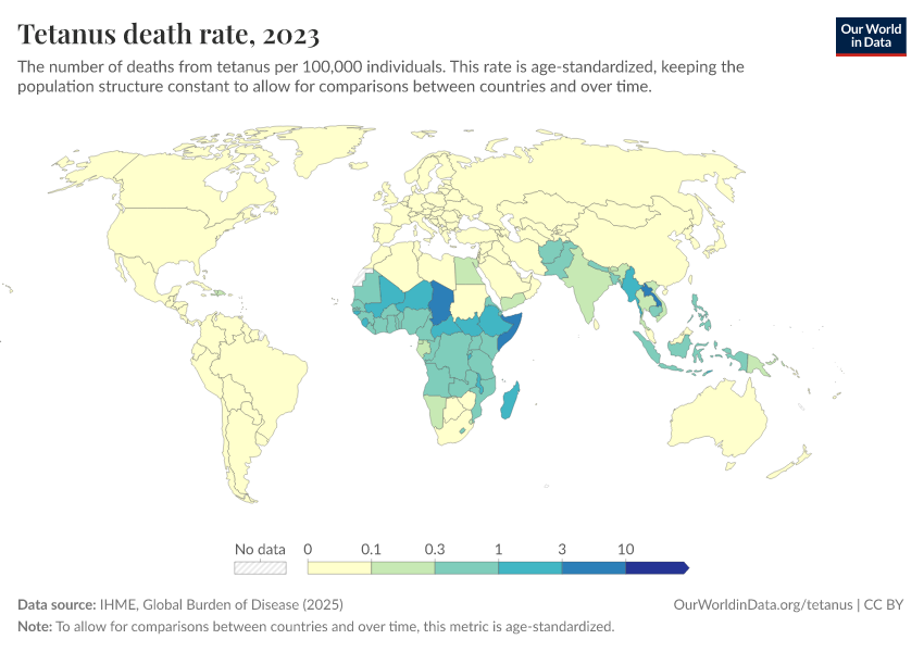 IHME, Global Burden of Disease (2025) – with major processing by Our World in Data. “Tetanus death rate – IHME” [dataset]. IHME, Global Burden of Disease, “Global Burden of Disease - Deaths” [original data]. Retrieved April 5, 2026 from https://archive.ourworldindata.org/20260323-161325/grapher/tetanus-death-rate.html (archived on March 23, 2026).