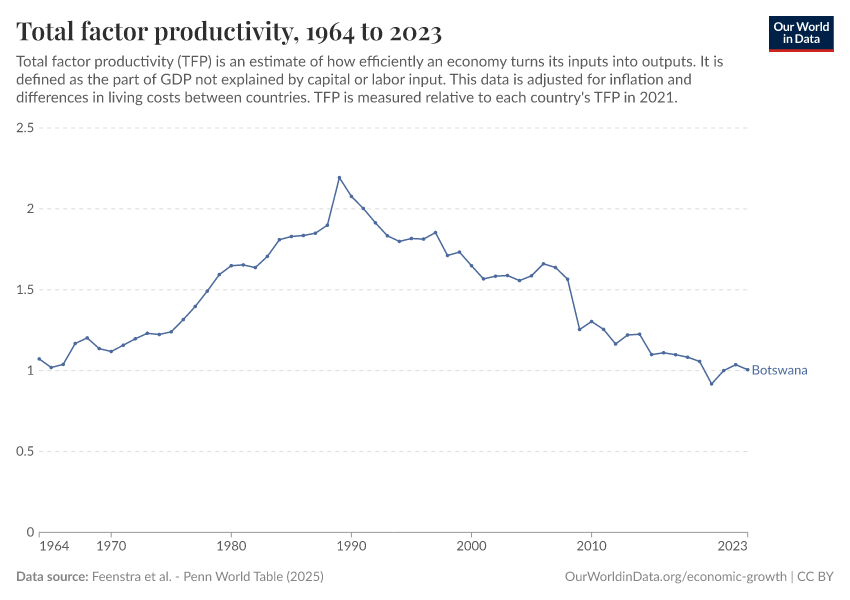 “Data Page: Total factor productivity”, part of the following publication: Max Roser, Bertha Rohenkohl, Pablo Arriagada, Joe Hasell, Hannah Ritchie, and Esteban Ortiz-Ospina (2023) - “Economic Growth”. Data adapted from Feenstra et al.. Retrieved from https://archive.ourworldindata.org/20251013-111729/grapher/tfp-at-constant-national-prices-20111.html [online resource] (archived on October 13, 2025).How to cite this data