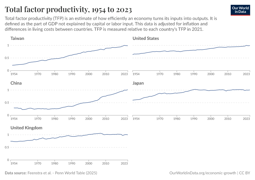 “Data Page: Total factor productivity”, part of the following publication: Max Roser, Bertha Rohenkohl, Pablo Arriagada, Joe Hasell, Hannah Ritchie, and Esteban Ortiz-Ospina (2023) - “Economic Growth”. Data adapted from Feenstra et al.. Retrieved from https://archive.ourworldindata.org/20251013-111729/grapher/tfp-at-constant-national-prices-20111.html [online resource] (archived on October 13, 2025).How to cite this data
