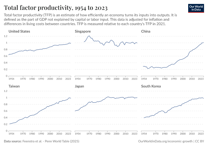 “Data Page: Total factor productivity”, part of the following publication: Max Roser, Bertha Rohenkohl, Pablo Arriagada, Joe Hasell, Hannah Ritchie, and Esteban Ortiz-Ospina (2023) - “Economic Growth”. Data adapted from Feenstra et al.. Retrieved from https://archive.ourworldindata.org/20251013-111729/grapher/tfp-at-constant-national-prices-20111.html [online resource] (archived on October 13, 2025).