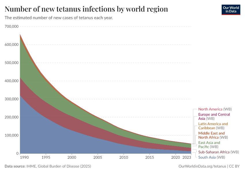 IHME, Global Burden of Disease (2025) – with major processing by Our World in Data. “Number of new tetanus infections by world region” [dataset]. IHME, Global Burden of Disease, “Global Burden of Disease - Prevalence and Incidence” [original data]. Retrieved March 3, 2026 from https://archive.ourworldindata.org/20260212-172132/grapher/the-number-of-new-tetanus-infections-by-world-region.html (archived on February 12, 2026).