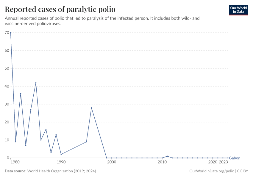 World Health Organization (2019); World Health Organization (2024) – processed by Our World in Data. “Reported cases of paralytic polio” [dataset]. World Health Organization, “WHO Historical Polio Dataset”; World Health Organization, “Polio Cases and Acute Flaccid Paralysis (AFP) Surveillance” [original data]. Retrieved December 6, 2025 from https://archive.ourworldindata.org/20250909-093708/grapher/the-number-of-reported-paralytic-polio-cases.html (archived on September 9, 2025).