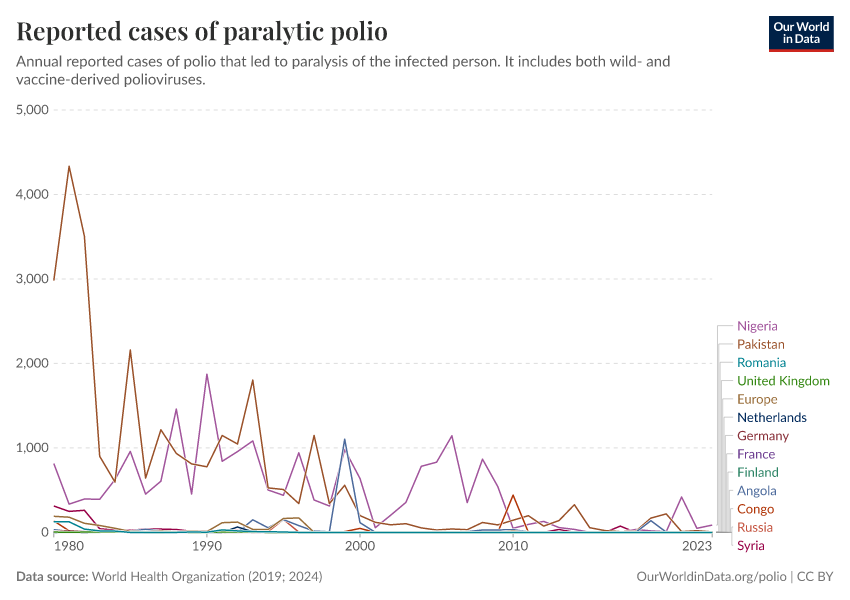 World Health Organization (2019); World Health Organization (2024) – processed by Our World in Data. “Reported cases of paralytic polio” [dataset]. World Health Organization, “WHO Historical Polio Dataset”; World Health Organization, “Polio Cases and Acute Flaccid Paralysis (AFP) Surveillance” [original data]. Retrieved January 16, 2026 from https://archive.ourworldindata.org/20250909-093708/grapher/the-number-of-reported-paralytic-polio-cases.html (archived on September 9, 2025).