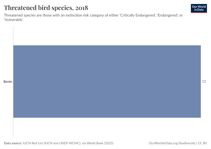 “Data Page: Threatened bird species”. Our World in Data (2026). Data adapted from IUCN Red List (IUCN and UNEP-WCMC), via World Bank. Retrieved from https://archive.ourworldindata.org/20251220-152415/grapher/threatened-bird-species.html [online resource] (archived on December 20, 2025).How to cite this data