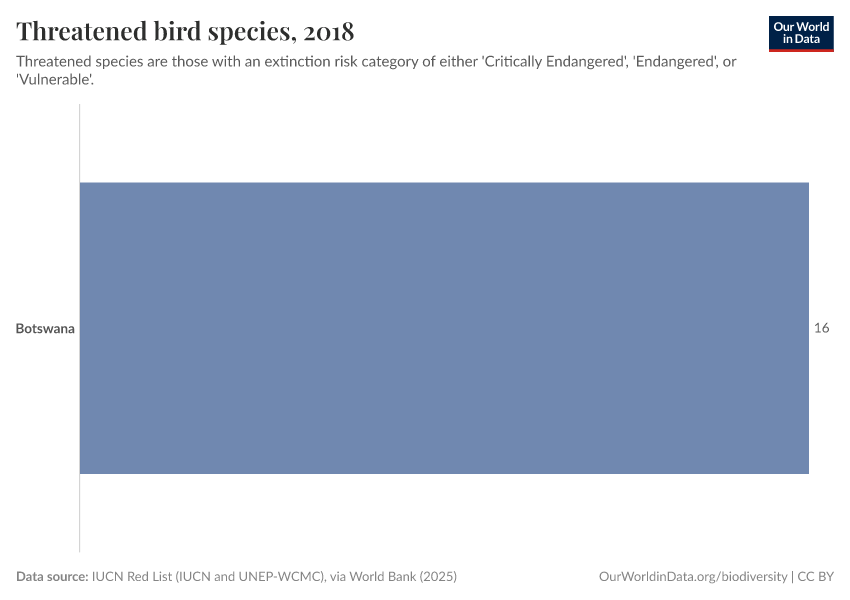 “Data Page: Threatened bird species”. Our World in Data (2026). Data adapted from IUCN Red List (IUCN and UNEP-WCMC), via World Bank. Retrieved from https://archive.ourworldindata.org/20251220-152415/grapher/threatened-bird-species.html [online resource] (archived on December 20, 2025).How to cite this data