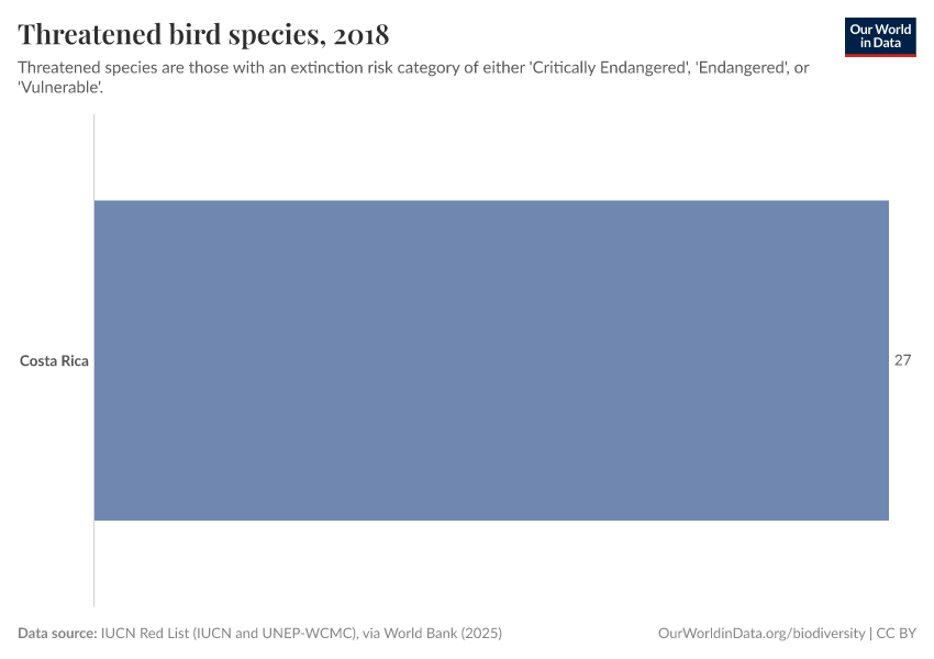 “Data Page: Threatened bird species”. Our World in Data (2025). Data adapted from IUCN Red List (IUCN and UNEP-WCMC), via World Bank. Retrieved from https://archive.ourworldindata.org/20251220-152415/grapher/threatened-bird-species.html [online resource] (archived on December 20, 2025).How to cite this data