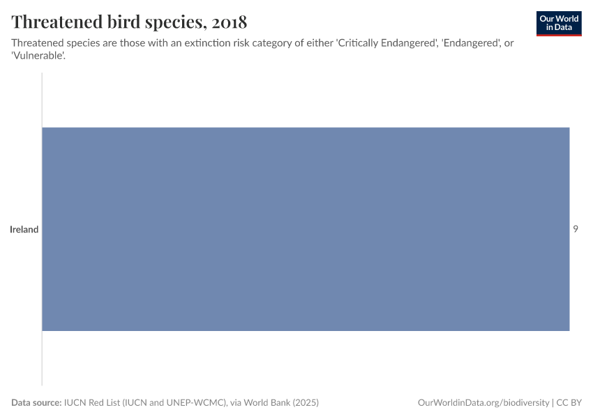“Data Page: Threatened bird species”. Our World in Data (2025). Data adapted from IUCN Red List (IUCN and UNEP-WCMC), via World Bank. Retrieved from https://archive.ourworldindata.org/20251220-152415/grapher/threatened-bird-species.html [online resource] (archived on December 20, 2025).How to cite this data