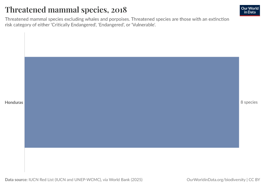 “Data Page: Threatened mammal species”. Our World in Data (2026). Data adapted from IUCN Red List (IUCN and UNEP-WCMC), via World Bank. Retrieved from https://archive.ourworldindata.org/20260112-111535/grapher/threatened-mammal-species.html [online resource] (archived on January 12, 2026).