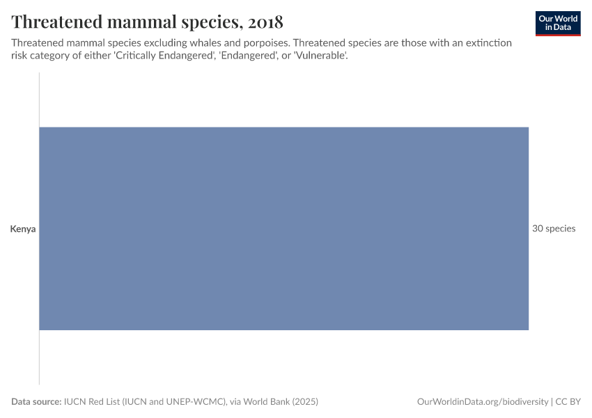 “Data Page: Threatened mammal species”. Our World in Data (2026). Data adapted from IUCN Red List (IUCN and UNEP-WCMC), via World Bank. Retrieved from https://archive.ourworldindata.org/20251220-152415/grapher/threatened-mammal-species.html [online resource] (archived on December 20, 2025).How to cite this data