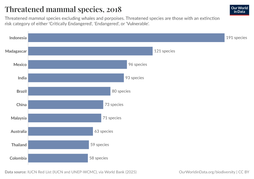 “Data Page: Threatened mammal species”. Our World in Data (2025). Data adapted from IUCN Red List (IUCN and UNEP-WCMC), via World Bank. Retrieved from https://archive.ourworldindata.org/20251220-152415/grapher/threatened-mammal-species.html [online resource] (archived on December 20, 2025).How to cite this data