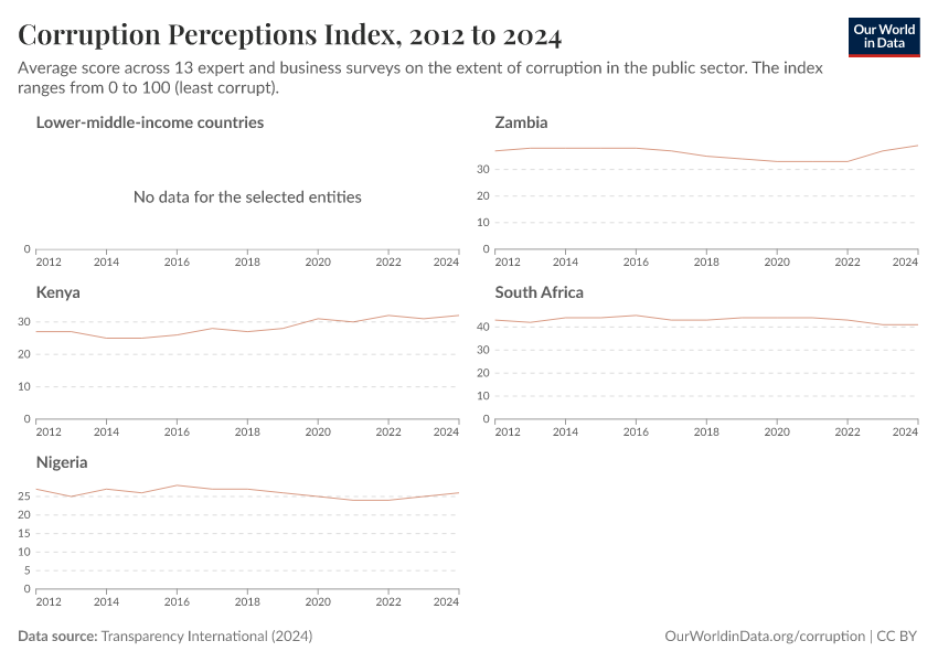 Transparency International (2024) – with minor processing by Our World in Data. “Corruption Perceptions Index (CPI)” [dataset]. Transparency International, “Corruption Perceptions Index” [original data]. Retrieved February 7, 2026 from https://archive.ourworldindata.org/20260105-133053/grapher/ti-corruption-perception-index.html (archived on January 5, 2026).