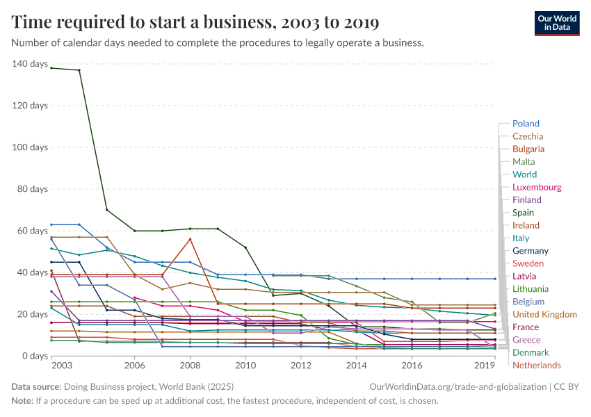 “Data Page: Time required to start a business”. Our World in Data (2025). Data adapted from Doing Business project, World Bank. Retrieved from https://archive.ourworldindata.org/20250909-093708/grapher/time-required-to-start-business.html [online resource] (archived on September 9, 2025).How to cite this data