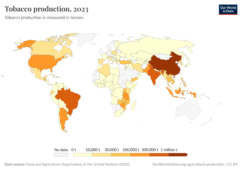 “Data Page: Tobacco production”, part of the following publication: Hannah Ritchie, Pablo Rosado, and Max Roser (2023) - “Agricultural Production”. Data adapted from Food and Agriculture Organization of the United Nations. Retrieved from https://archive.ourworldindata.org/20251014-161652/grapher/tobacco-production.html [online resource] (archived on October 14, 2025).How to cite this data