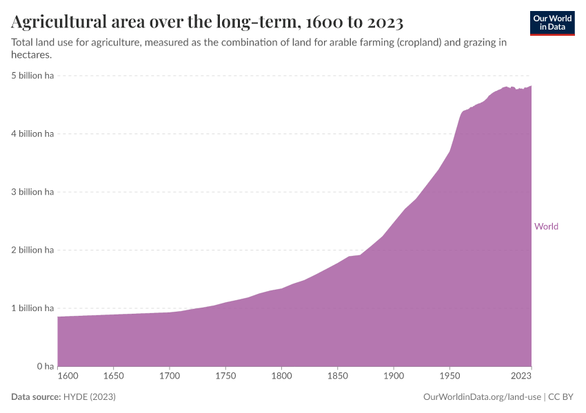 “Data Page: Agricultural area over the long-term”, part of the following publication: Hannah Ritchie, Lucas Rodés-Guirao, Edouard Mathieu, Marcel Gerber, Esteban Ortiz-Ospina, Joe Hasell, and Max Roser (2023) - “Population Growth”. Data adapted from PBL Netherlands Environmental Assessment Agency. Retrieved from https://archive.ourworldindata.org/20251023-195030/grapher/total-agricultural-area-over-the-long-term.html [online resource] (archived on October 23, 2025).How to cite this data