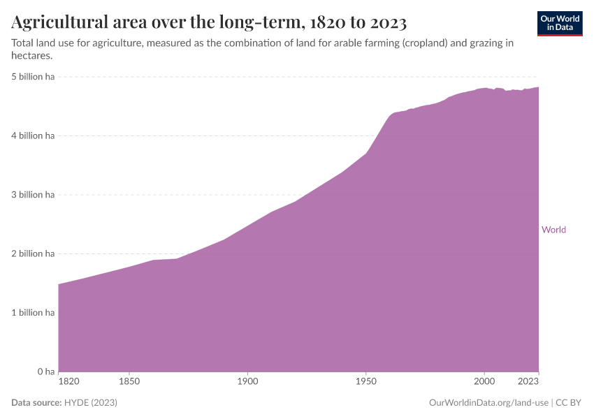 “Data Page: Agricultural area over the long-term”, part of the following publication: Hannah Ritchie, Lucas Rodés-Guirao, Edouard Mathieu, Marcel Gerber, Esteban Ortiz-Ospina, Joe Hasell, and Max Roser (2023) - “Population Growth”. Data adapted from PBL Netherlands Environmental Assessment Agency. Retrieved from https://archive.ourworldindata.org/20251023-195030/grapher/total-agricultural-area-over-the-long-term.html [online resource] (archived on October 23, 2025).How to cite this data