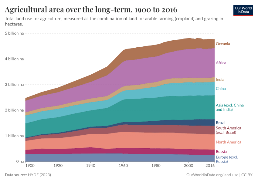 “Data Page: Agricultural area over the long-term”, part of the following publication: Hannah Ritchie, Lucas Rodés-Guirao, Edouard Mathieu, Marcel Gerber, Esteban Ortiz-Ospina, Joe Hasell, and Max Roser (2023) - “Population Growth”. Data adapted from PBL Netherlands Environmental Assessment Agency. Retrieved from https://archive.ourworldindata.org/20251023-195030/grapher/total-agricultural-area-over-the-long-term.html [online resource] (archived on October 23, 2025).How to cite this data
