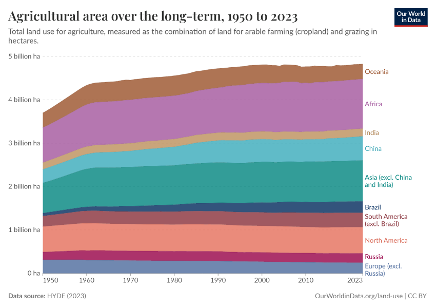“Data Page: Agricultural area over the long-term”, part of the following publication: Hannah Ritchie, Lucas Rodés-Guirao, Edouard Mathieu, Marcel Gerber, Esteban Ortiz-Ospina, Joe Hasell, and Max Roser (2023) - “Population Growth”. Data adapted from PBL Netherlands Environmental Assessment Agency. Retrieved from https://archive.ourworldindata.org/20251023-195030/grapher/total-agricultural-area-over-the-long-term.html [online resource] (archived on October 23, 2025).