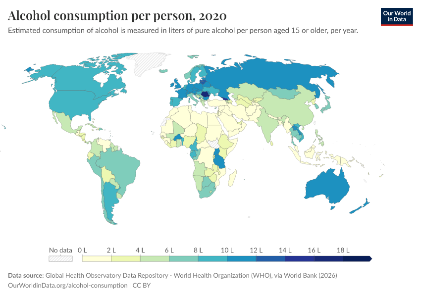 “Data Page: Total alcohol consumption per capita”. Our World in Data (2026). Data adapted from Global Health Observatory Data Repository - World Health Organization (WHO), via World Bank. Retrieved from https://archive.ourworldindata.org/20260317-174010/grapher/total-alcohol-consumption-per-capita-litres-of-pure-alcohol.html [online resource] (archived on March 17, 2026).How to cite this data