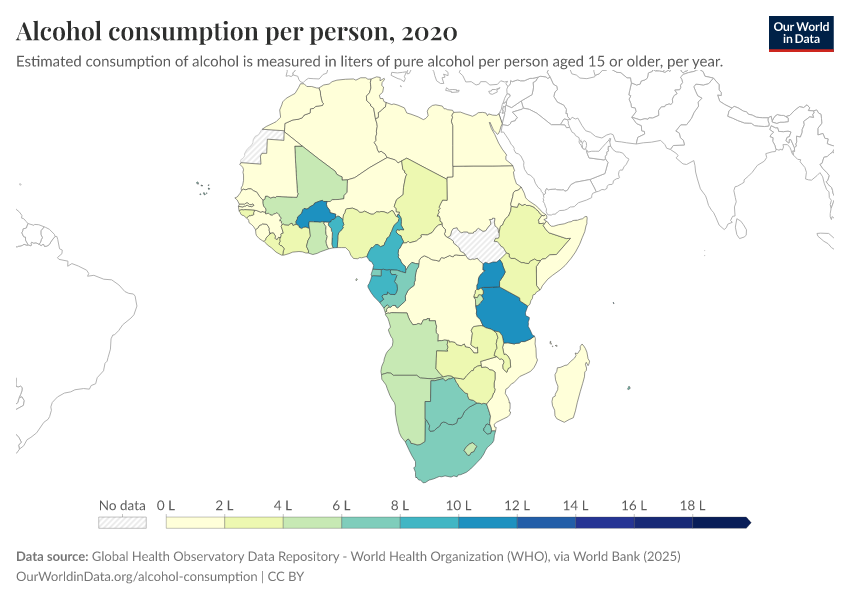 “Data Page: Total alcohol consumption per capita”. Our World in Data (2026). Data adapted from Global Health Observatory Data Repository - World Health Organization (WHO), via World Bank. Retrieved from https://archive.ourworldindata.org/20260112-111535/grapher/total-alcohol-consumption-per-capita-litres-of-pure-alcohol.html [online resource] (archived on January 12, 2026).How to cite this data