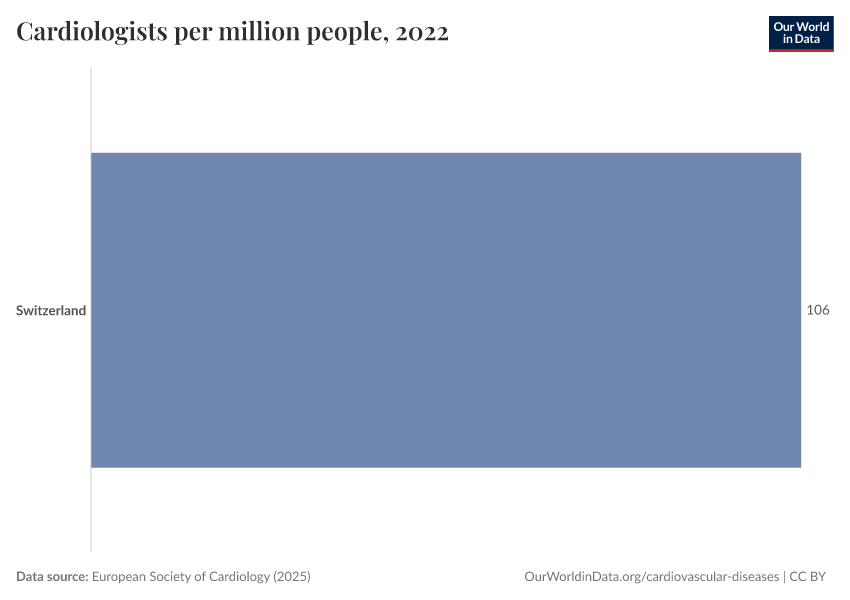 “Data Page: Cardiologists per million people”, part of the following publication: Saloni Dattani, Veronika Samborska, Hannah Ritchie, and Max Roser (2023) - “Cardiovascular Diseases”. Data adapted from European Society of Cardiology. Retrieved from https://archive.ourworldindata.org/20251027-150426/grapher/total-cardiologists-per-million-people.html [online resource] (archived on October 27, 2025).How to cite this data