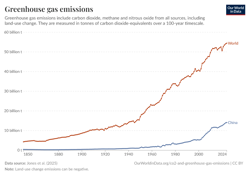 Jones et al. (2025) – with major processing by Our World in Data. “Annual greenhouse gas emissions including land use” [dataset]. Jones et al., “National contributions to climate change 2025.1” [original data]. Retrieved December 13, 2025 from https://archive.ourworldindata.org/20251204-133820/grapher/total-ghg-emissions.html (archived on December 4, 2025).