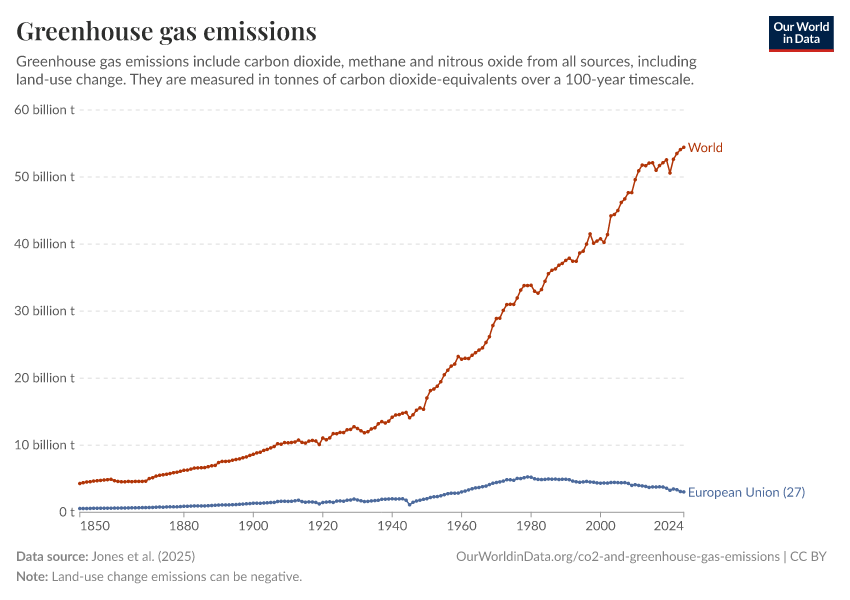 Jones et al. (2025) – with major processing by Our World in Data. “Annual greenhouse gas emissions including land use” [dataset]. Jones et al., “National contributions to climate change 2025.1” [original data]. Retrieved December 10, 2025 from https://archive.ourworldindata.org/20251204-133820/grapher/total-ghg-emissions.html (archived on December 4, 2025).