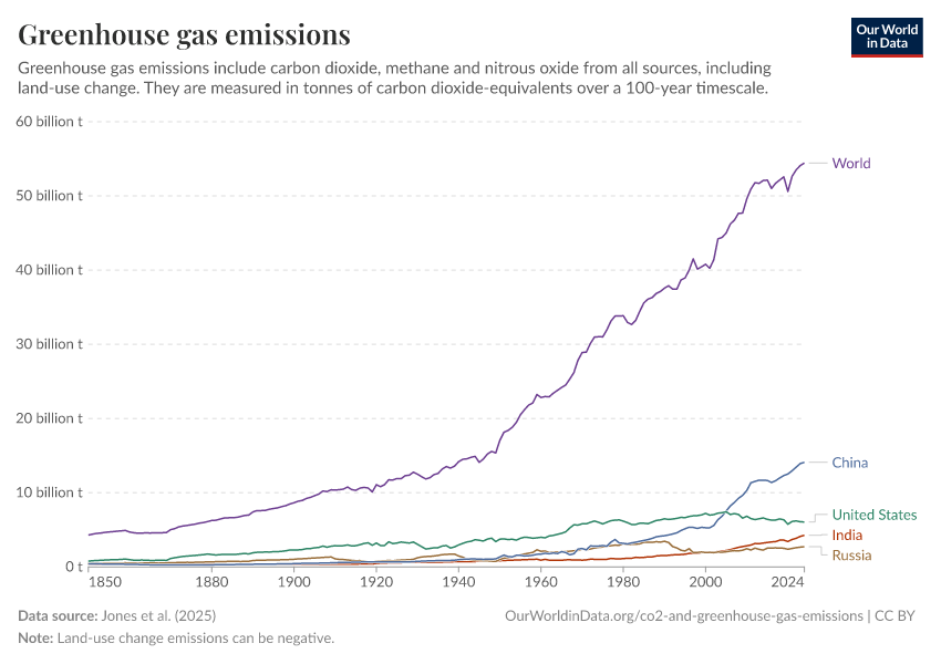 “Data Page: Annual greenhouse gas emissions including land use”, part of the following publication: Hannah Ritchie, Pablo Rosado, and Max Roser (2023) - “CO₂ and Greenhouse Gas Emissions”. Data adapted from Jones et al.. Retrieved from https://archive.ourworldindata.org/20251204-133820/grapher/total-ghg-emissions.html [online resource] (archived on December 4, 2025).