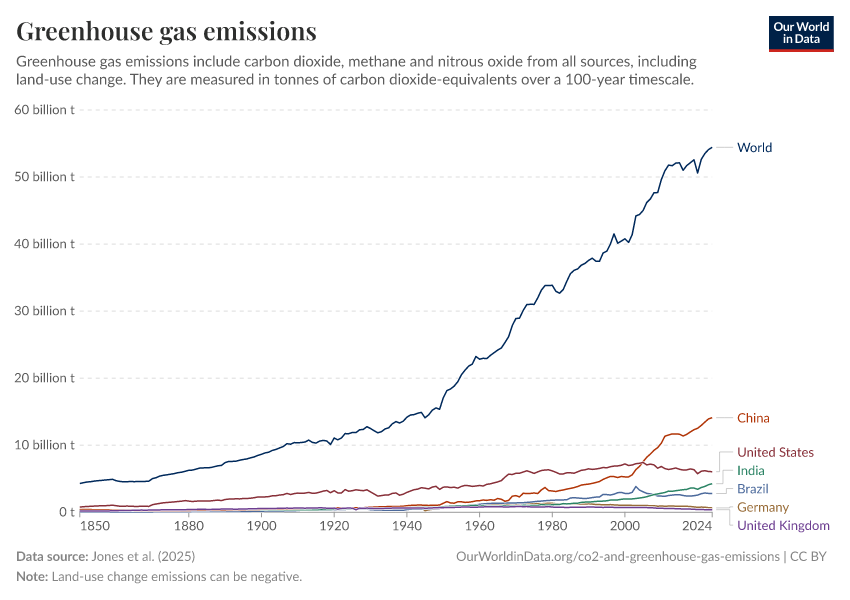 Jones et al. (2025) – with major processing by Our World in Data. “Annual greenhouse gas emissions including land use” [dataset]. Jones et al., “National contributions to climate change 2025.1” [original data]. Retrieved December 15, 2025 from https://archive.ourworldindata.org/20251204-133820/grapher/total-ghg-emissions.html (archived on December 4, 2025).