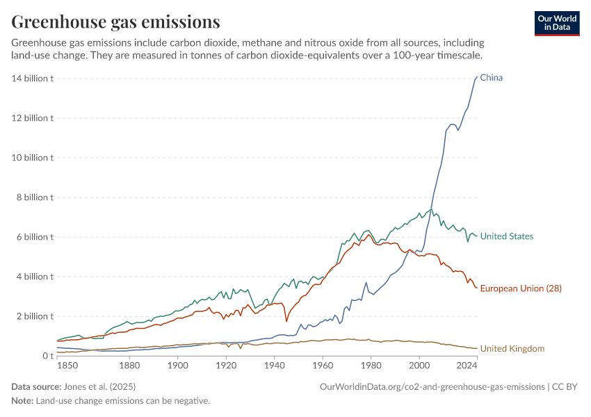 Jones et al. (2025) – with major processing by Our World in Data. “Annual greenhouse gas emissions including land use” [dataset]. Jones et al., “National contributions to climate change 2025.1” [original data]. Retrieved April 7, 2026 from https://archive.ourworldindata.org/20260304-094028/grapher/total-ghg-emissions.html (archived on March 4, 2026).Download