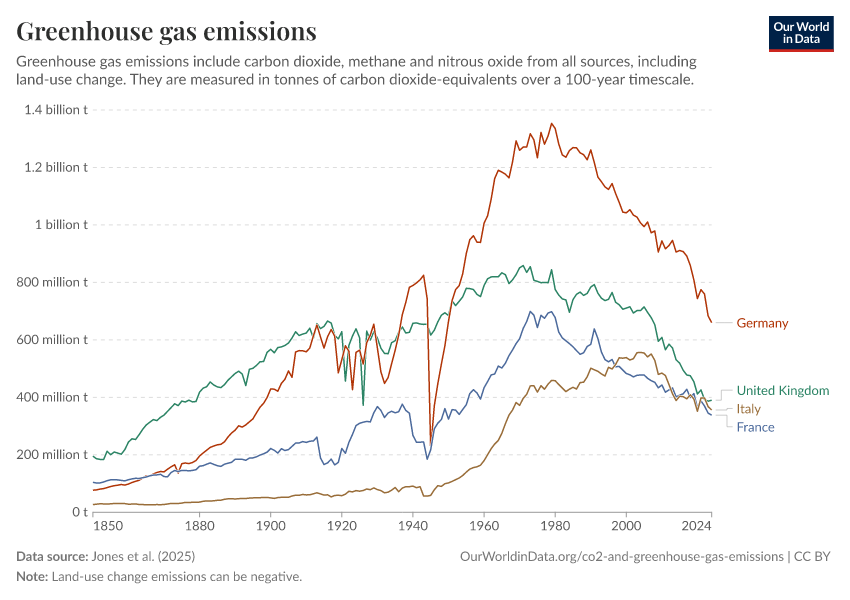 Jones et al. (2025) – with major processing by Our World in Data. “Annual greenhouse gas emissions including land use” [dataset]. Jones et al., “National contributions to climate change 2025.1” [original data]. Retrieved December 10, 2025 from https://archive.ourworldindata.org/20251204-133820/grapher/total-ghg-emissions.html (archived on December 4, 2025).