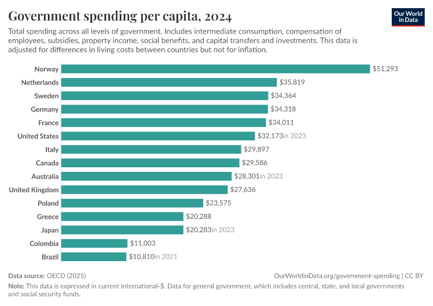 OECD (2025) – with minor processing by Our World in Data. “Government spending per capita – OECD” [dataset]. OECD, “Public finance main indicators - Government at a glance, Yearly updates”; OECD, “Size of public procurement - Government at a glance indicators, Yearly updates”; OECD, “Public finance by economic transaction - Government at a glance indicators, Yearly updates”; OECD, “Public finance by function - Government at a glance indicators, Yearly updates” [original data]. Retrieved January 14, 2026 from https://archive.ourworldindata.org/20250909-093708/grapher/total-gov-expenditure-percapita-oecd.html (archived on September 9, 2025).