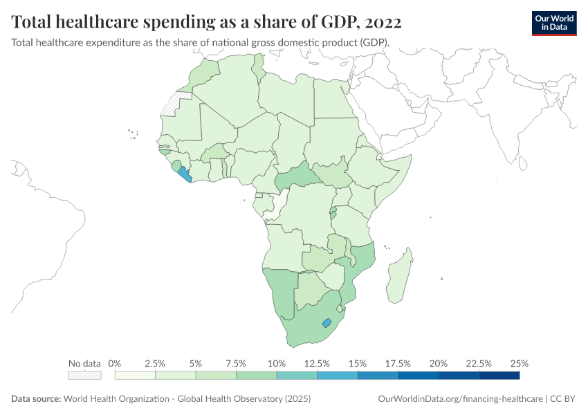 “Data Page: Total healthcare spending as a share of GDP”. Our World in Data (2026). Data adapted from World Health Organization. Retrieved from https://archive.ourworldindata.org/20250909-093708/grapher/total-healthcare-expenditure-gdp.html [online resource] (archived on September 9, 2025).How to cite this data