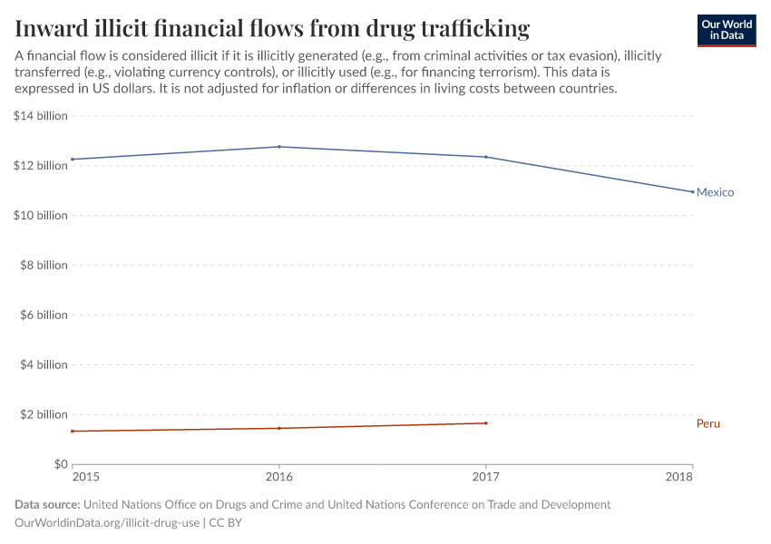 “Data Page: Inward illicit financial flows from drug trafficking”. Our World in Data (2025). Data adapted from United Nations Office on Drugs and Crime and United Nations Conference on Trade and Development. Retrieved from https://archive.ourworldindata.org/20251120-211749/grapher/total-inward-financial-flows-from-drug-trafficking.html [online resource] (archived on November 20, 2025).How to cite this data