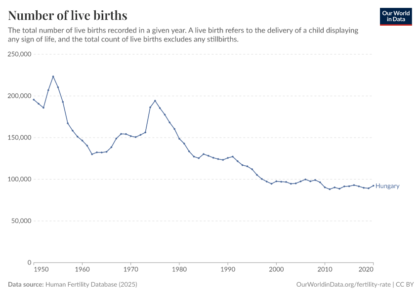 “Data Page: Number of live births”, part of the following publication: Saloni Dattani, Lucas Rodés-Guirao, and Max Roser (2025) - “Fertility Rate”. Data adapted from Human Fertility Database. Retrieved from https://archive.ourworldindata.org/20251022-230420/grapher/total-live-births-hfd.html [online resource] (archived on October 22, 2025).How to cite this data