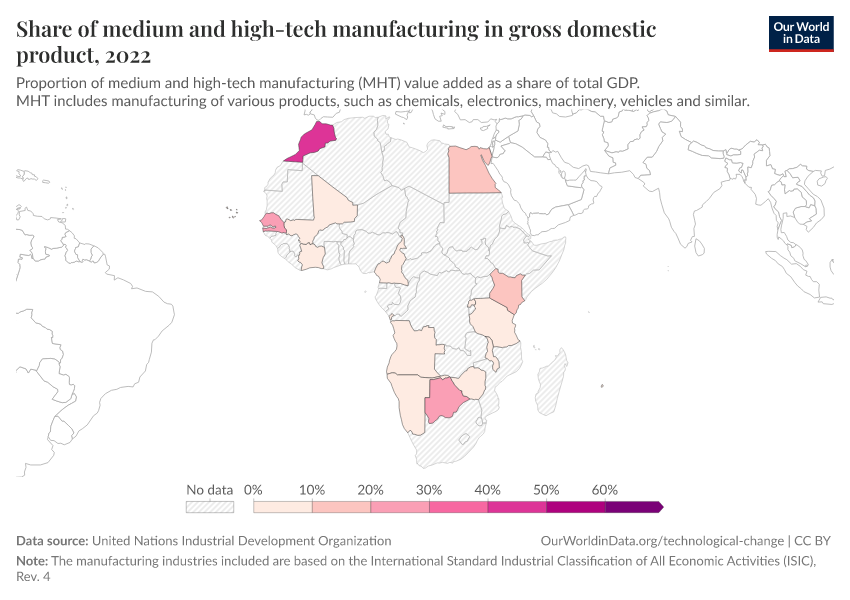 “Data Page: Share of medium and high-tech manufacturing in gross domestic product”. Our World in Data (2026). Data adapted from United Nations Industrial Development Organization. Retrieved from https://archive.ourworldindata.org/20251120-211038/grapher/total-manufacturing-value-added-from-high-tech.html [online resource] (archived on November 20, 2025).How to cite this data