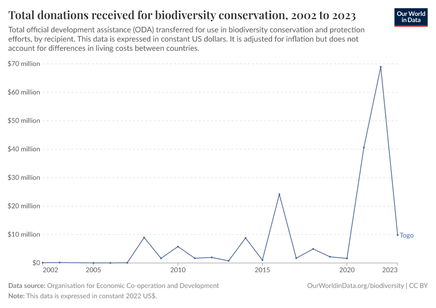 “Data Page: Total donations received for biodiversity conservation”. Our World in Data (2025). Data adapted from Organisation for Economic Co-operation and Development. Retrieved from https://archive.ourworldindata.org/20251125-165536/grapher/total-oda-for-biodiversity-by-recipient.html [online resource] (archived on November 25, 2025).How to cite this data
