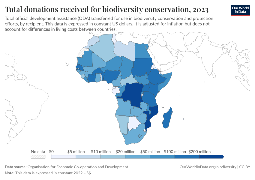 “Data Page: Total donations received for biodiversity conservation”. Our World in Data (2026). Data adapted from Organisation for Economic Co-operation and Development. Retrieved from https://archive.ourworldindata.org/20251125-165536/grapher/total-oda-for-biodiversity-by-recipient.html [online resource] (archived on November 25, 2025).How to cite this data
