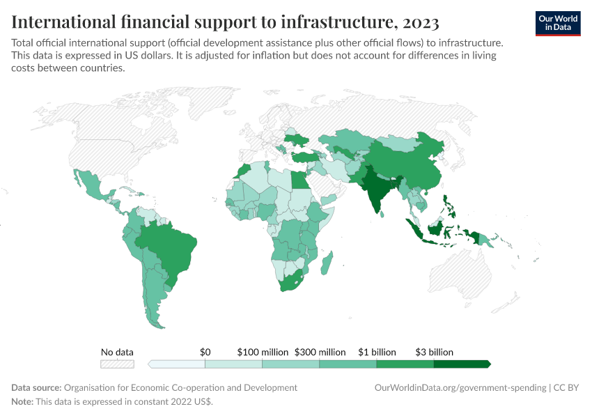 “Data Page: International financial support to infrastructure”. Our World in Data (2025). Data adapted from Organisation for Economic Co-operation and Development. Retrieved from https://archive.ourworldindata.org/20251125-165536/grapher/total-oda-for-infrastructure-by-recipient.html [online resource] (archived on November 25, 2025).