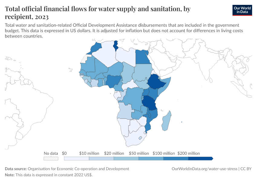 “Data Page: Total official financial flows for water supply and sanitation, by recipient”. Our World in Data (2026). Data adapted from Organisation for Economic Co-operation and Development. Retrieved from https://archive.ourworldindata.org/20251125-165536/grapher/total-oda-for-water-supply-and-sanitation-by-recipient.html [online resource] (archived on November 25, 2025).