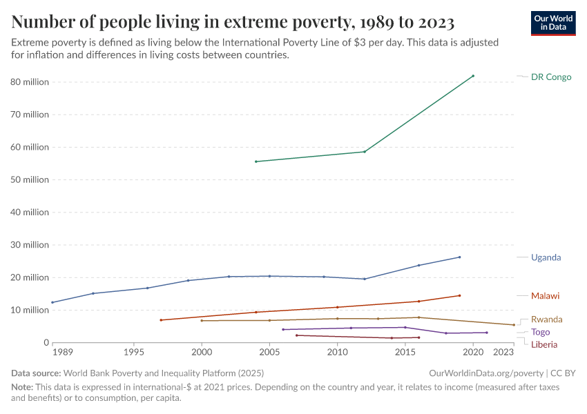 “Data Page: Number of people living in extreme poverty”, part of the following publication: Joe Hasell, Bertha Rohenkohl, Pablo Arriagada, Esteban Ortiz-Ospina, and Max Roser (2022) - “Poverty”. Data adapted from World Bank Poverty and Inequality Platform. Retrieved from https://archive.ourworldindata.org/20251030-150736/grapher/total-population-in-extreme-poverty.html [online resource] (archived on October 30, 2025).