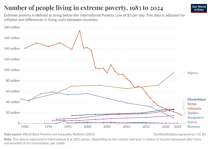 World Bank Poverty and Inequality Platform (2025) – with major processing by Our World in Data. “Number of people living in extreme poverty – World Bank” [dataset]. World Bank Poverty and Inequality Platform, “World Bank Poverty and Inequality Platform (PIP) 20250930_2021, 20250930_2017” [original data]. Retrieved April 4, 2026 from https://archive.ourworldindata.org/20260304-094028/grapher/total-population-in-extreme-poverty.html (archived on March 4, 2026).Download