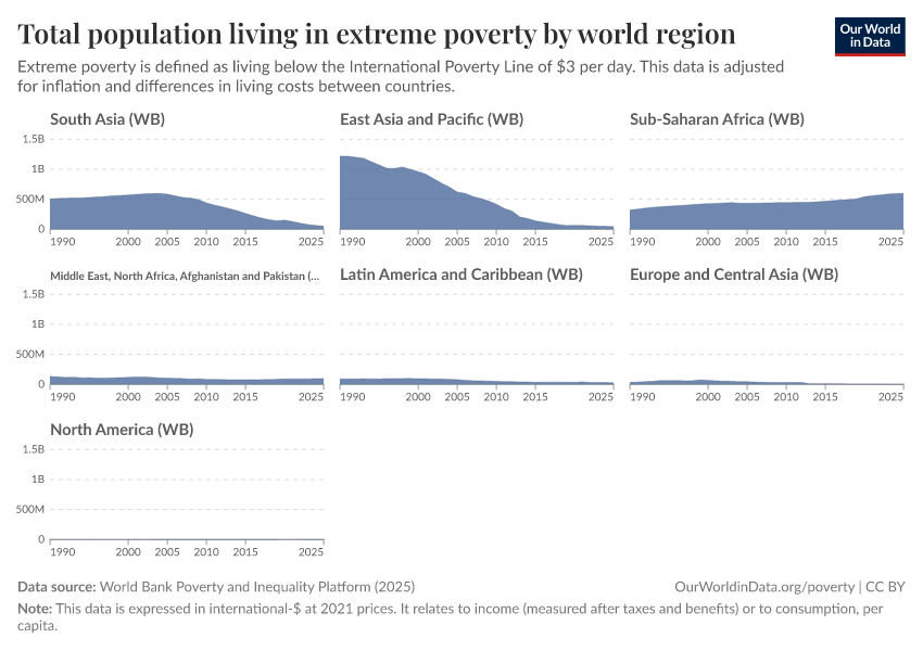 World Bank Poverty and Inequality Platform (2025) – with major processing by Our World in Data. “Total population living in extreme poverty by world region – World Bank” [dataset]. World Bank Poverty and Inequality Platform, “World Bank Poverty and Inequality Platform (PIP) 20250930_2021, 20250930_2017” [original data]. Retrieved January 15, 2026 from https://archive.ourworldindata.org/20251111-170441/grapher/total-population-living-in-extreme-poverty-by-world-region.html (archived on November 11, 2025).