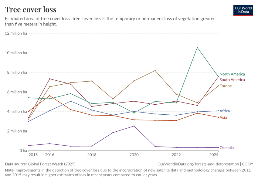“Data Page: Tree cover loss”, part of the following publication: Hannah Ritchie, Fiona Spooner, and Max Roser (2021) - “Forests and Deforestation”. Data adapted from Global Forest Watch. Retrieved from https://archive.ourworldindata.org/20250909-093708/grapher/tree-cover-loss.html [online resource] (archived on September 9, 2025).How to cite this data