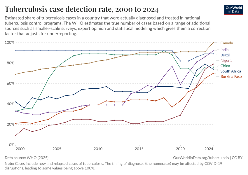 WHO (2025) – with minor processing by Our World in Data. “Tuberculosis case detection rate” [dataset]. WHO, “Global Tuberculosis Report - Burden Estimates” [original data]. Retrieved April 5, 2026 from https://archive.ourworldindata.org/20260304-094028/grapher/tuberculosis-case-detection-rate.html (archived on March 4, 2026).Download