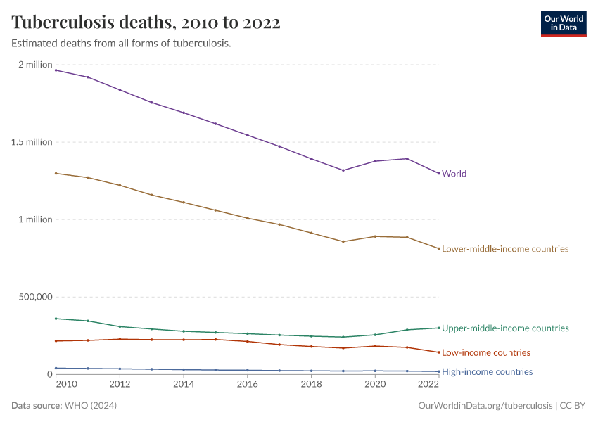 “Data Page: Tuberculosis deaths”, part of the following publication: Saloni Dattani, Fiona Spooner, Hannah Ritchie, and Max Roser (2023) - “Tuberculosis”. Data adapted from WHO. Retrieved from https://archive.ourworldindata.org/20250909-093708/grapher/tuberculosis-deaths-who.html [online resource] (archived on September 9, 2025).How to cite this data